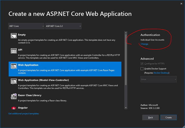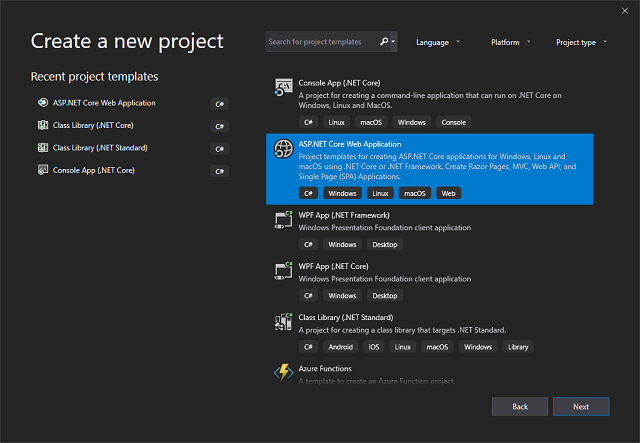 Let's start by creating a basic ASP.NET Core 2.2 web application (I'm using VS2019):