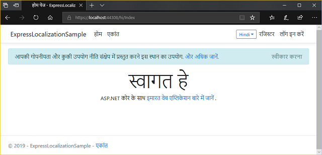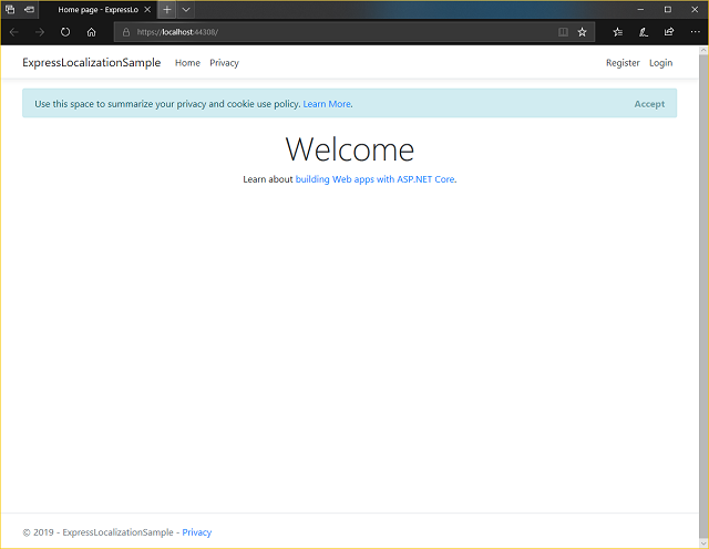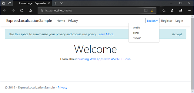 var cultures = new[] { new CultureInfo("tr"), new CultureInfo("ar"), new CultureInfo("hi"), new CultureInfo("en"), }; services.AddMvc() .AddExpressLocalization( ops => { ops.ResourcesPath = "LocalizationResources"; ops.RequestLocalizationOptions = o => { o.SupportedCultures = cultures; o.SupportedUICultures = cultures; o.DefaultRequestCulture = new RequestCulture("en"); }; }) .SetCompatibilityVersion(CompatibilityVersion.Version_2_2); Then under Configure method, configure the app to use request localization: