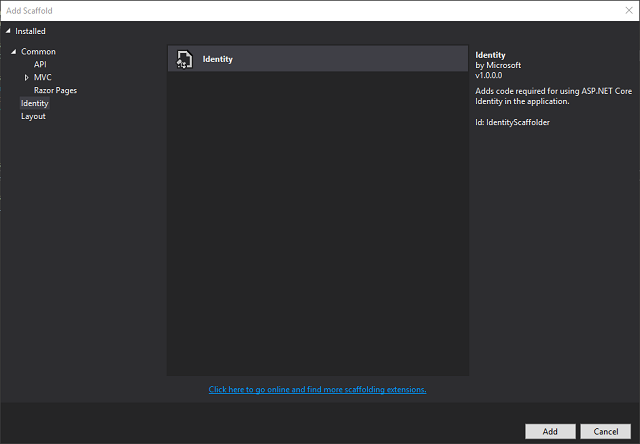 When you click Add, a new Areas folder will be created including all identity related views: