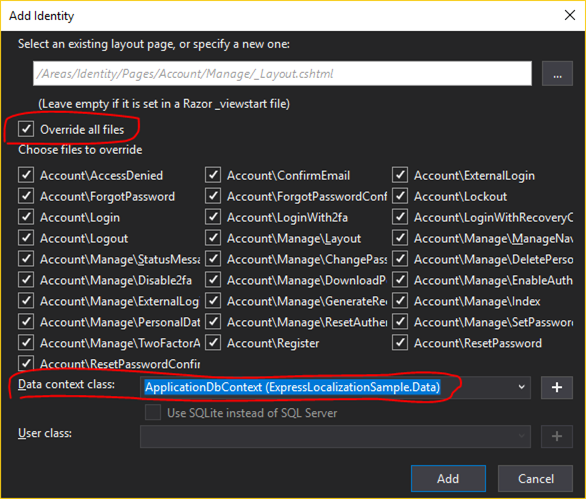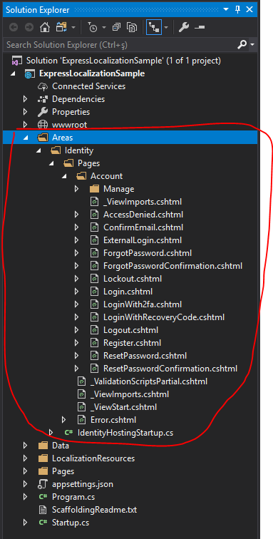 namespace ExpressLocalizationSample.LocalizationResources { public class ViewLocalizationResource { } } Under LocalizationResources folder, create new public class and name it "ExpressLocalizationResource", this class will be used to group resource files for identity, model binding and data annotations.