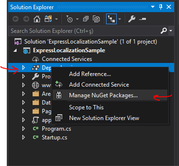 - In the solution explorer under the project name, right click on Dependencies and select "Manage Nuget Packages".