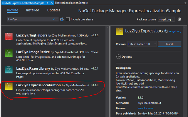 LazZiya", select "LazZiya.ExpressLocalization" and click "Install", select the latest version and install. - It will ask to install two packages, click "Ok" and wait till installation is done:
