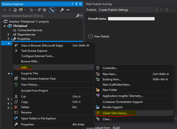 Right click on projects wwwroot folder then navigate to Add and then click New Client Side Library
