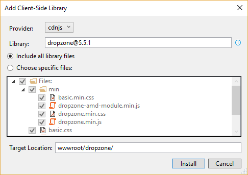 In the opened dialog type dropzone, select the latet version (v5.5.1 used in this tutorial) and click Install: