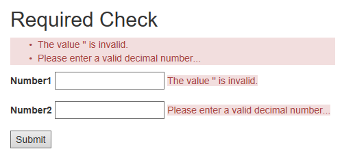 } If you submit empty values the error message of Number1 will not appear, because it is non-nullable by default so it will not perform nullcheck, but Number2 will be checked because it is nullable.